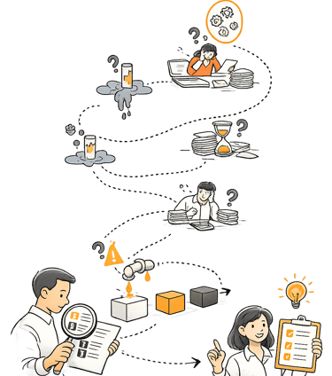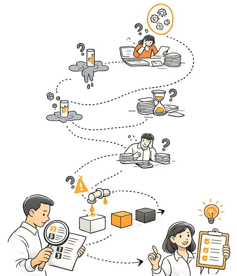 We review how work moves through your business and send a 1 page scorecard with the top 3 fixes to save time, reduce errors, and remove manual busywork.